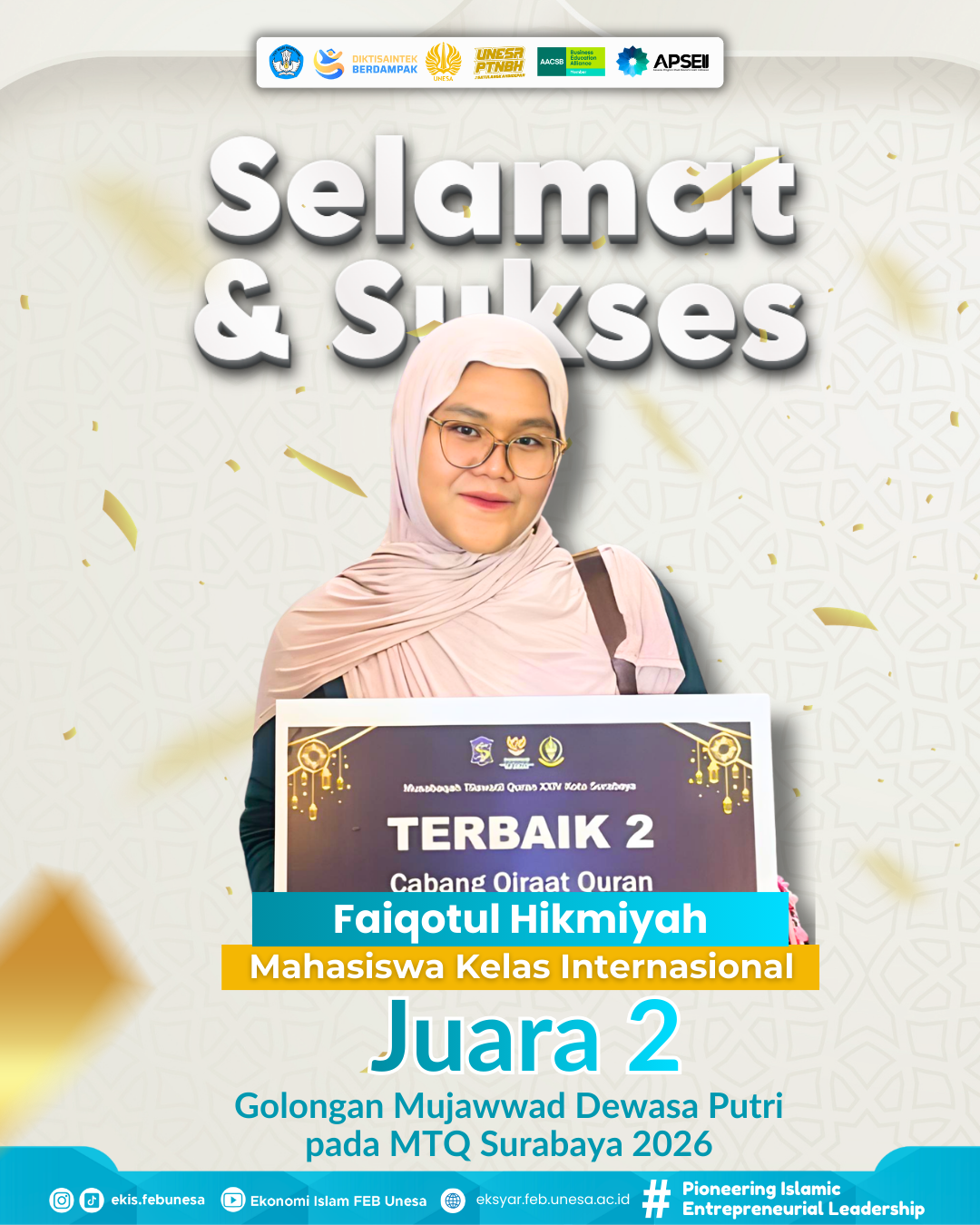 Di bulan yang penuh berkah, Ramadhan 1447 H, kabar membanggakan datang dari mahasiswa Program Studi Ekonomi Islam, Fakultas Ekonomika dan Bisnis Universitas Negeri Surabaya. Salah satu mahasiswa angkatan 202
